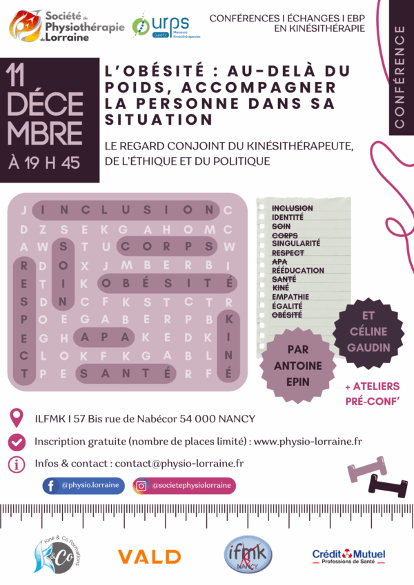 La SPL et l’URPS des masseurs-kinésithérapeutes Grand Est ont le plaisir de vous inviter à une soirée exceptionnelle consacrée à un sujet d’une actualité et d’une sensibilité majeures : l’accompagnement des personnes en situation d’obésité dans le cadre de la rééducation. Intitulée « L’obésité : au-delà du poids, accompagner la personne dans sa situation », cette soirée propose un regard croisé entre le soin, l’éthique et la société, pour mieux comprendre les enjeux multiples qui entourent cette pathologie complexe et multifactorielle. Dès 19h, les participants seront accueillis autour d’un pot de l’amitié, moment convivial cher à l’esprit de la SPL. En parallèle, trois ateliers participatifs permettront d’explorer de manière concrète les réalités de la rééducation des personnes en situation d’obésité :