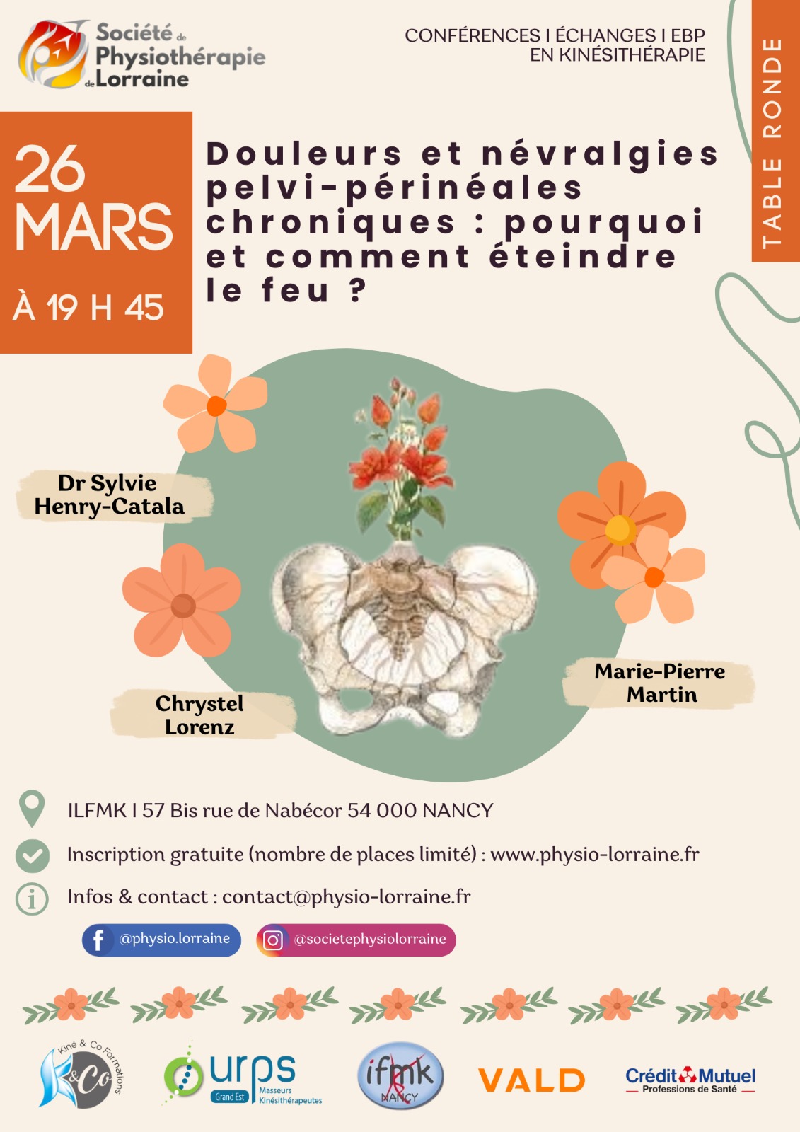 Cette table ronde sera une occasion privilégiée d’explorer les mécanismes de ces douleurs chroniques et d’aborder les stratégies thérapeutiques pour mieux accompagner vos patients. Que vous soyez déjà sensibilisé à la prise en charge de ces patients ou simplement curieux d’enrichir votre pratique, cette soirée vous permettra d’acquérir des connaissances précieuses sur une thématique en pleine évolution.Inscrivez-vous dès maintenant à cette soirée qui aura lieu le mardi 26 mars à l’IFMK de Nancy (57 Bis rue de Nabécor).